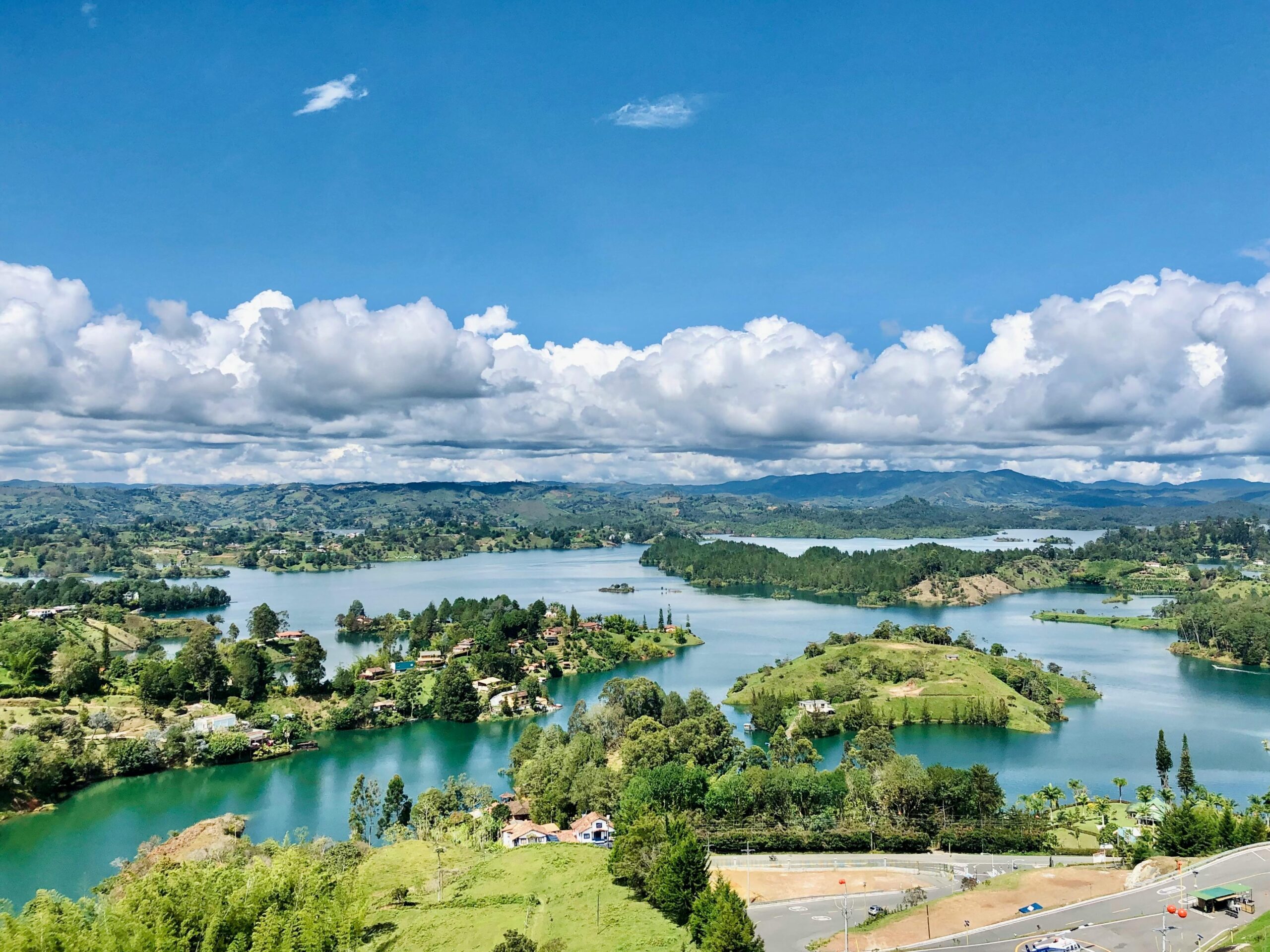 山並みに囲まれたアンティオキア県に、ひときわ鮮やかな色彩をまとった町・グアタペ(Guatapé)があります。その名は「石と水」を意味する言葉に由来すると伝えられ、自然と人が織り成す風景が町の中心にあります。町の顔とも言えるのが「エル・ペニョルの岩(La Piedra del Peñol)」です。海抜約2,100メートルの高さにそびえる巨大な一枚岩は、約7,000万年前に形成されたと言われており、今や自然のランドマークとしてグアタペの象徴になっています。その切り立った異様な姿から「悪魔のタワー」とも呼ばれています。740段の階段を登れば、岩頂からは手つかずの湖と緑の丘陵の広がる光景が待っています。その眺めを目当てに世界中から訪問者がやってきます。